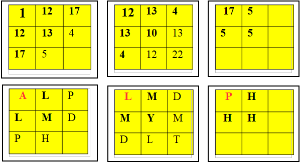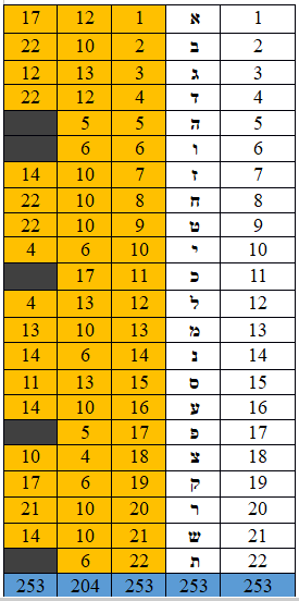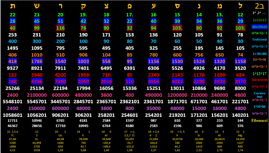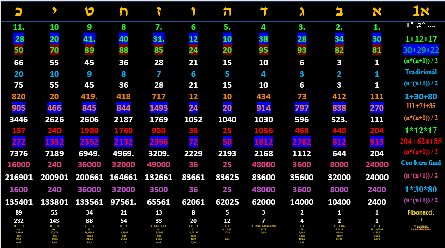 1 Àlef, 2 Bet, 3 Gimmel, 4 Dálet, 5 He, 6 Waw, 7 Záyin, 8 Jet, 9 teT, 10 Yod, 11 Kaf,