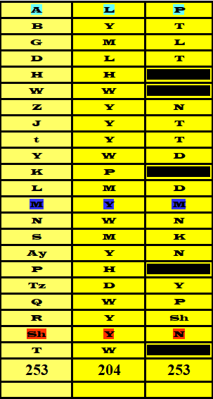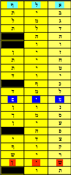 12 Lámed , 13 Mem, 14 Nun, 15 Samek, 16 Ayín, 17 Peh, 18 Tzádi, 19 Quf, 20 Resh, 21 Shin 22 Tau,