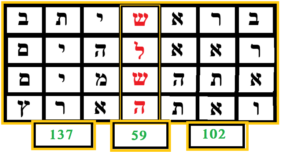 Wir sehen nun das durch dieses Wort das Vertikal den ganzen Kasten in Drei teilt, Rechts ein Zahlenwert 102 entsteht, in der Mitte das Wort Sheloshah eine Zahlenwert hat 59, und Links dieser Teil seinen eigenen Zahlenwert hat 137.